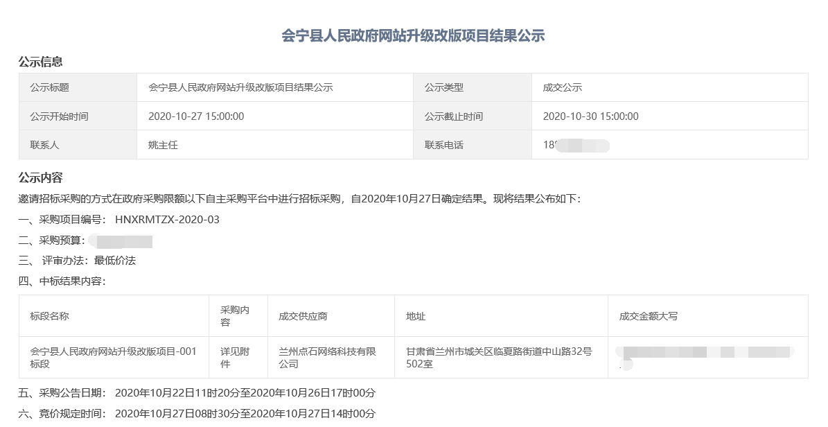 2020年10月,我司參加“會寧縣人民政府網站升級改版項目”招標會,在投標過程中以良好的信譽、豐富的行業經驗、強大的技術實力以及優秀的項目實施方案獲得了評標專家組的一致認可,以最佳的成績順利中標。