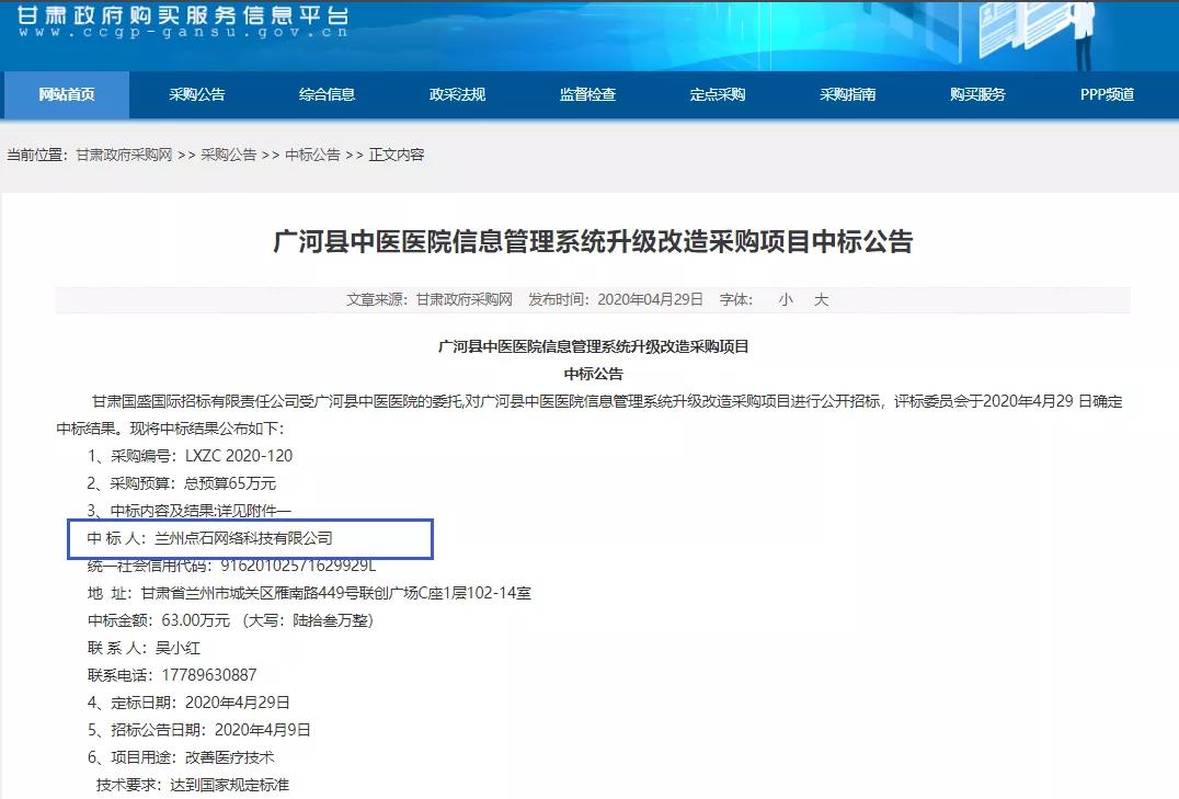 2020年4月29日,蘭州點石網絡科技有限公司在“廣河縣中醫醫院信息管理系統升級改造采購項目”的競標中,憑借過硬的產品質量、扎實高效的工作作風、強大的技術實力以及良好的企業信譽以絕對的優勢順利中標。